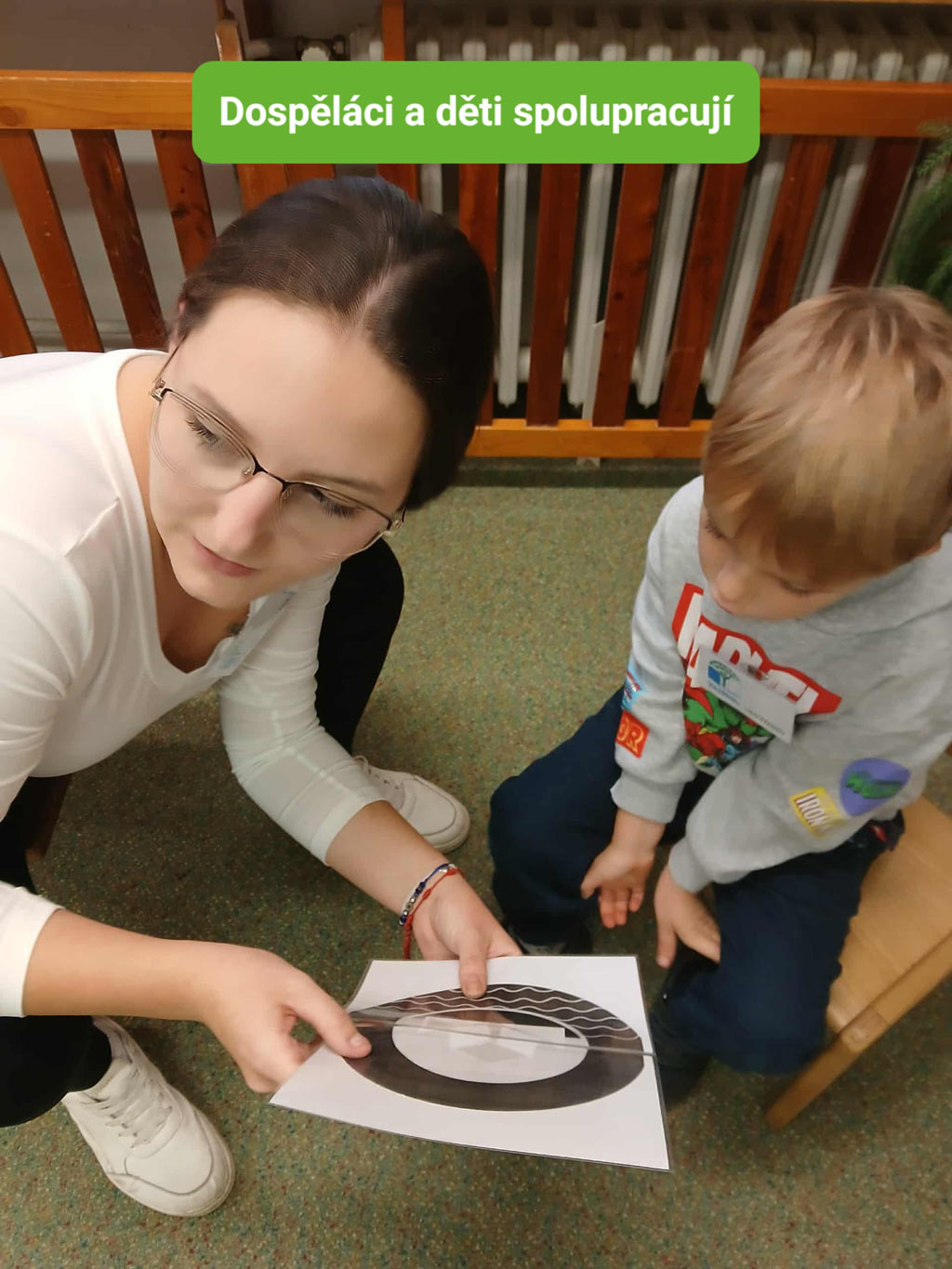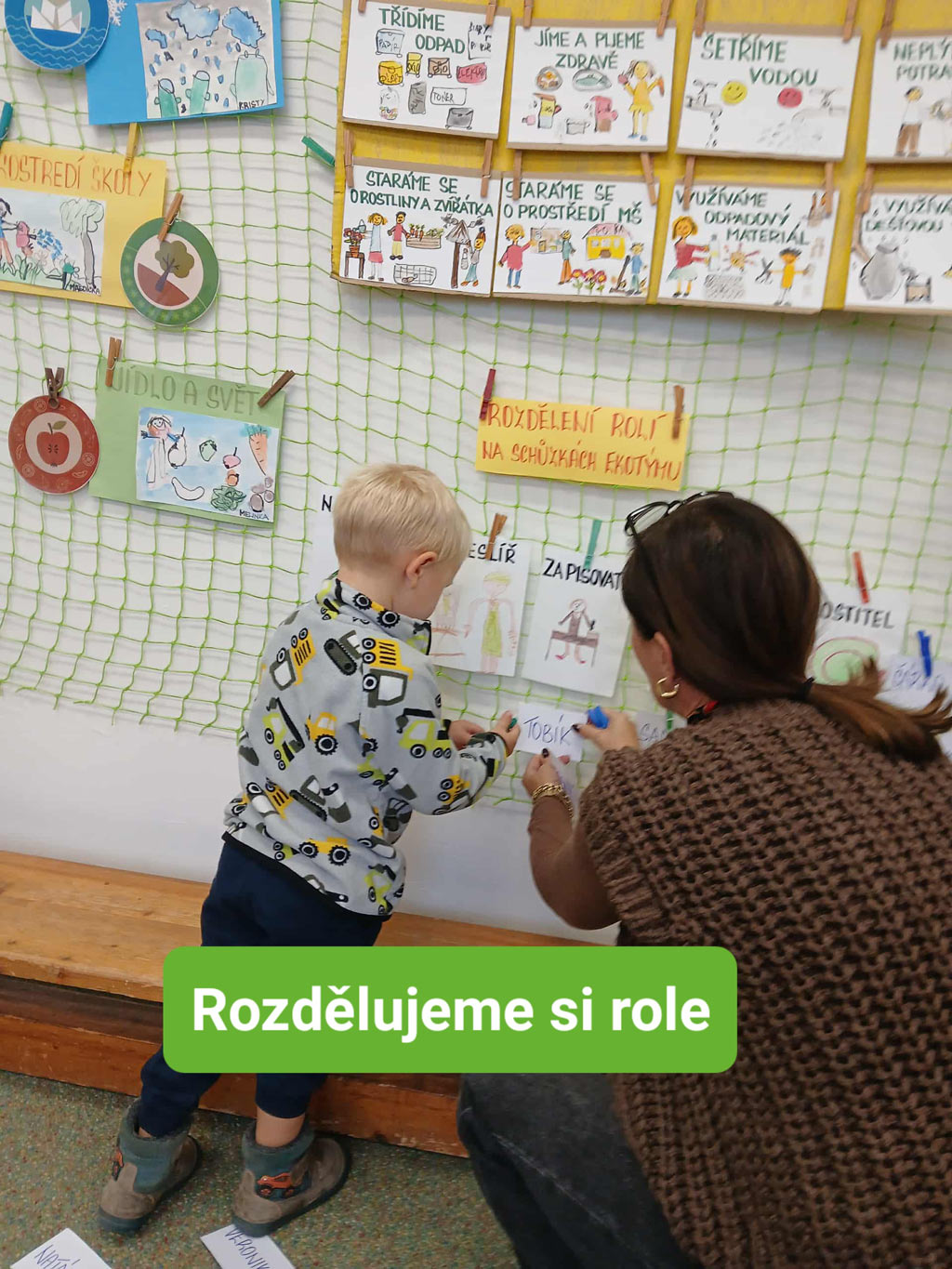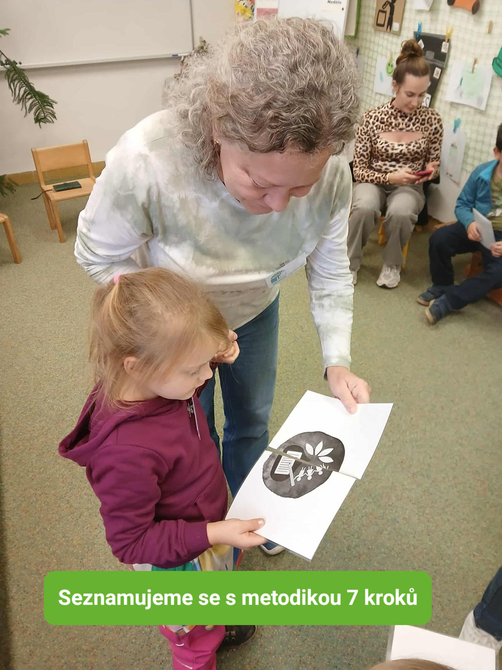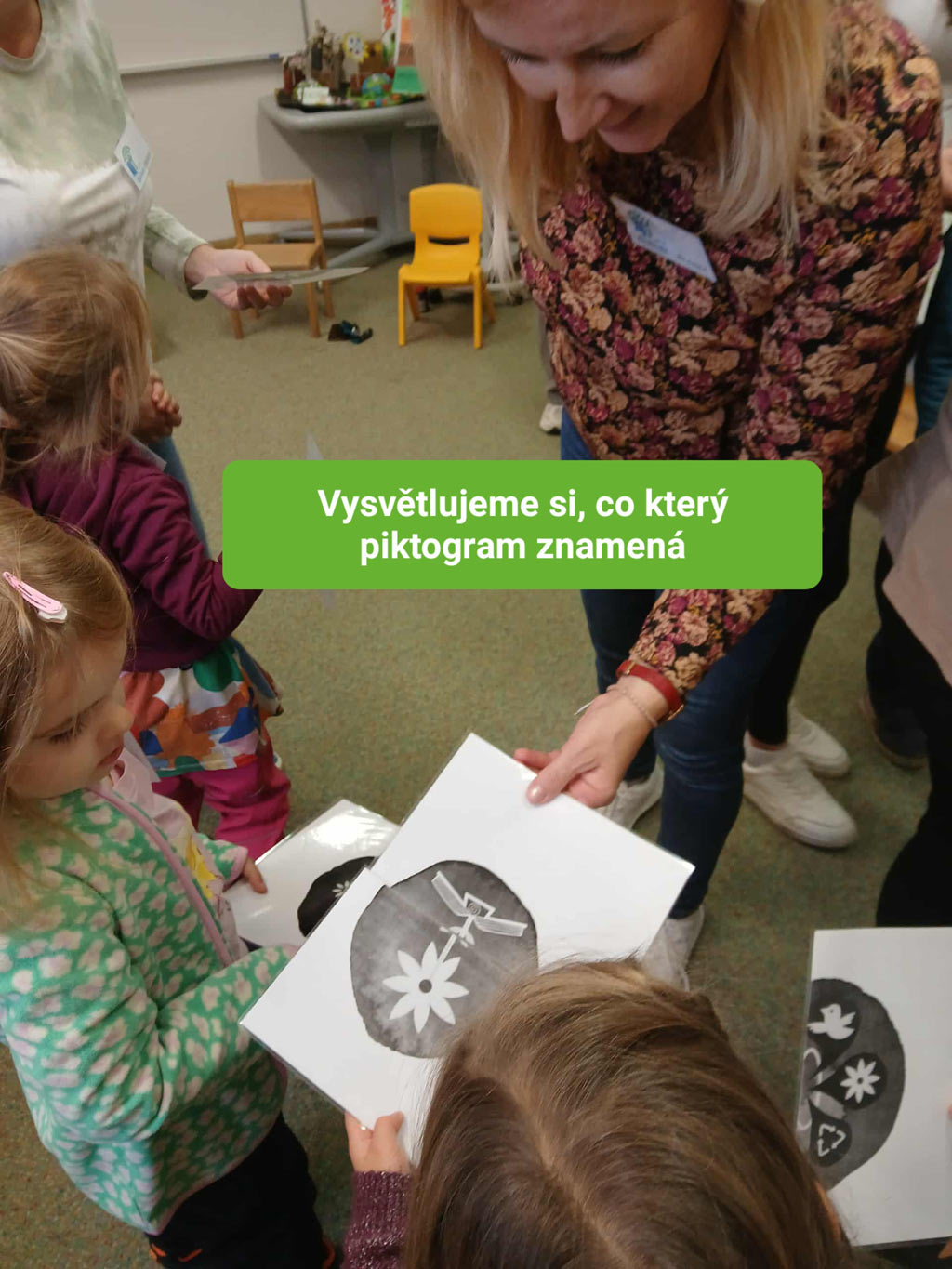 Poté jsme si vysvětlili pravidla fungování Ekotýmu a pustili se i do vážnější práce. Dospěláci i děti hledali rozpůlené piktogramy sedmi kroků Ekoškoly a následně spojovali své poloviny do dvojic. Každá dvojice pak ostatním představila, co jejich piktogram – krok – znamená.